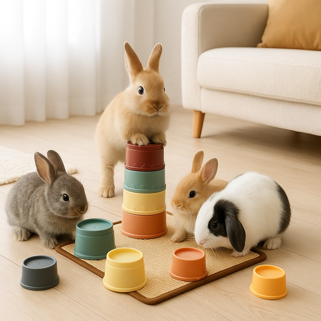 Stimulez l’intelligence et la curiosité de votre lapin avec ce jouet ludique et coloré ! Ces tasses à empiler en plastique sans danger sont parfaites pour cacher des friandises et encourager le jeu actif.